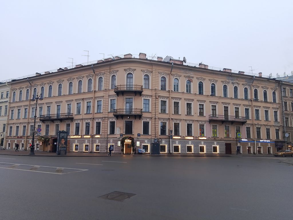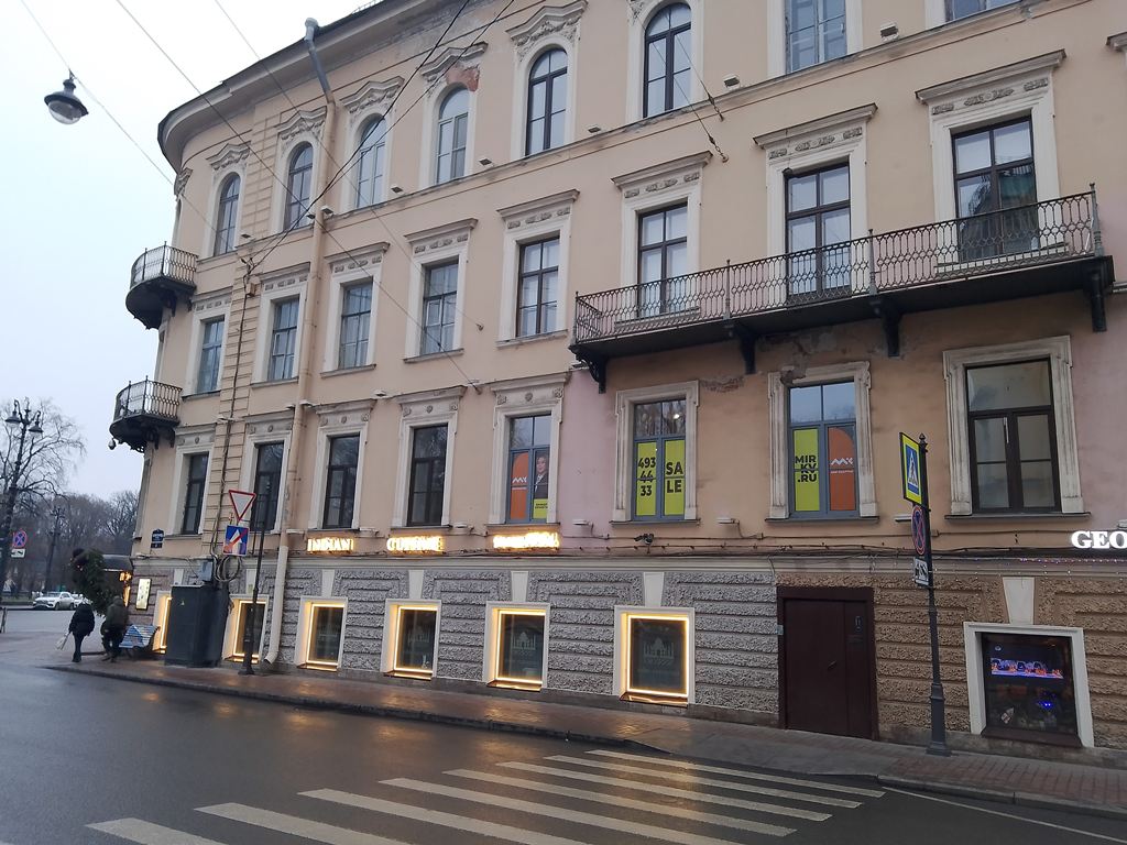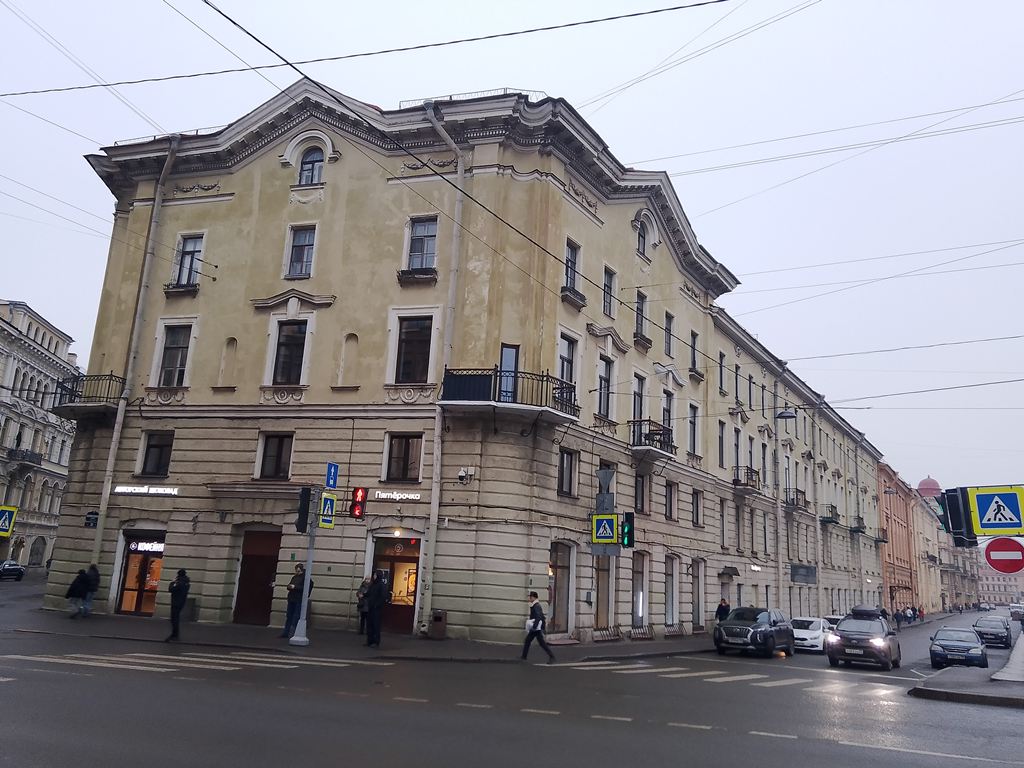 | наб. кан. Грибоедова, 77 / Вознесенский пр., 32 (бывш. пр. Майорова, 32) / Гражданская ул., 28 | | Жилой дом с разными магазинами, заведениями, организациями и учреждениями на 1 этаже. В т.ч. универсам "Перекресток". Предприятий социального питания нет (11.10.21) | | Жилой дом с разными магазинами, заведениями, организациями и учреждениями на 1 этаже. Предприятий социального питания нет (06.12.25) | (Фото) |