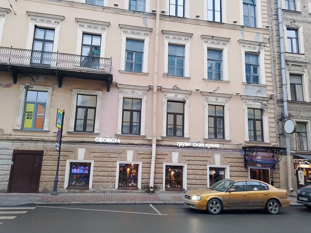 | Вознесенский пр., 25 | | Жилой дом с разными магазинами, заведениями, организациями и учреждениями на 1 этаже, в т.ч. Гранд-Кафе "Алазани". Предприятий социального питания нет (16.11.21) | | Жилой дом или бизнес-центр, с разными магазинами, организациями и учреждениями на 1 этаже. Предприятий общественного питания теперь нет. Предприятий социального питания нет (23.12.24) | (Фото) |