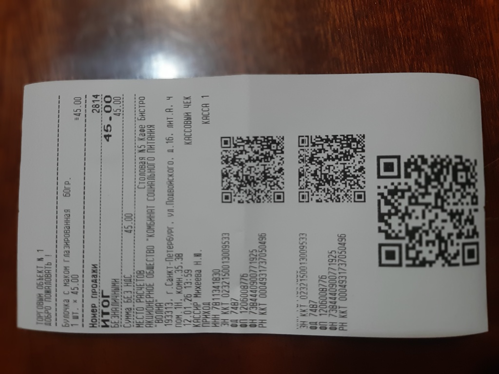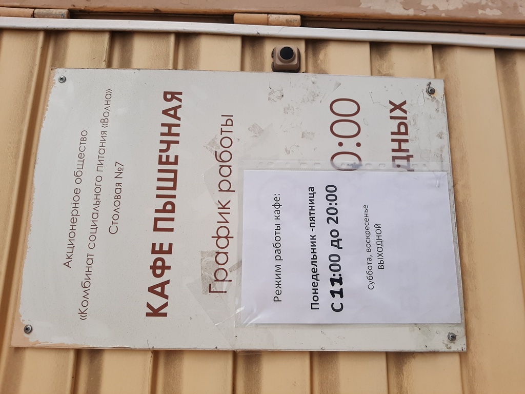 | ул. Подвойского, 16 | | Базовое предприятие №5 АО КСП "Волна" и кафе. Вывеска на входе новая - "Кафе, Пекарня", внутри не поменялось ничего (14.04.22) | | В кафе проведен ремонт, изменился ассортимент продукции (19.01.25) | | Комбинат питания работает, кафе закрыто в связи с праздничными днями (06.01.26) | | Комбинат питания и кафе работает (12.01.26) | | Фото кассового чека после посещения данного объекта | (Фото) |